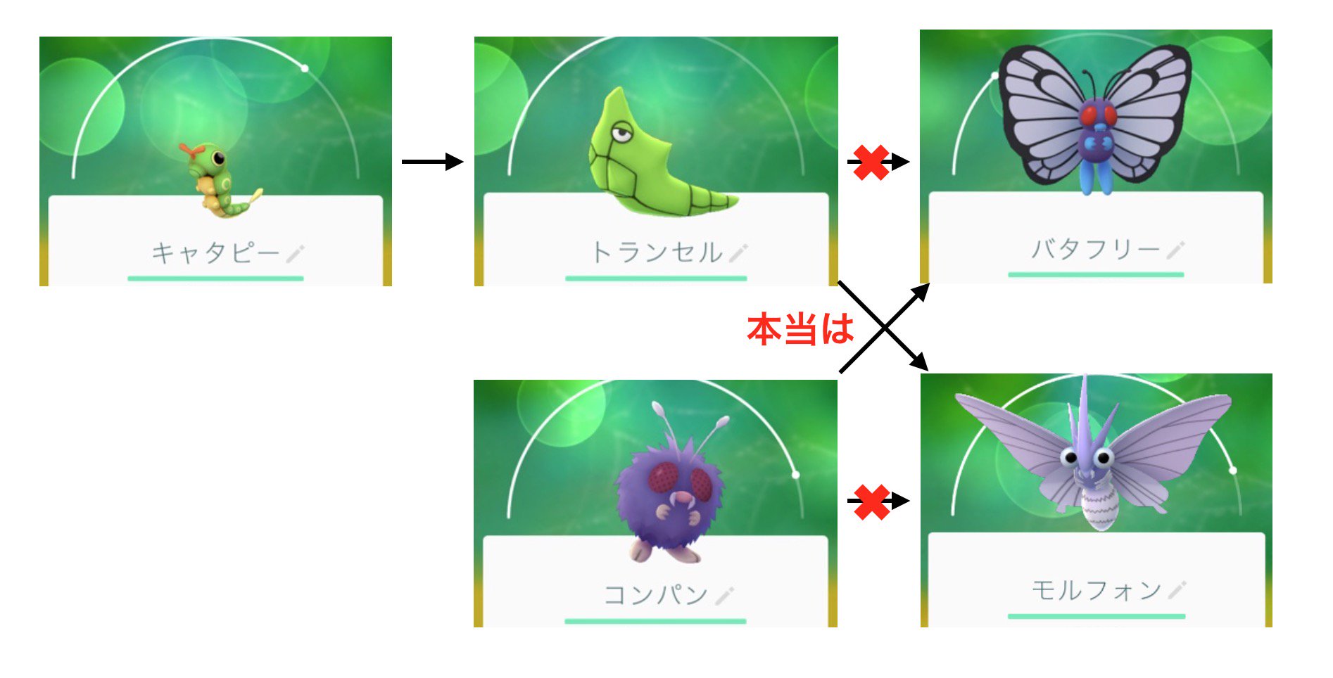 おばけ トランセル バタフリー と コンパン モルフォン はシステムミスで実は進化系逆の設定だったって話初代ポケモン世代にとっては常識みたいな話だけど ポケモンgo世代は知らないのかも 色やフォルム 目とか みたらわりと明らかだけど T